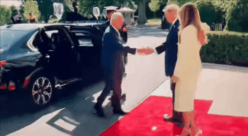 欢迎仪式上,查尔斯踏上美方为其铺设的红毯,并与特朗普握手。特朗普将于今年6月年满80岁,其标志性的强势握手力道极大。英媒报道称,双方握手时,查尔斯“并不示弱”,视频显示,双方手上较劲了近十秒。