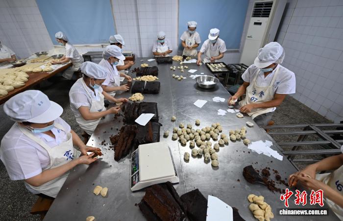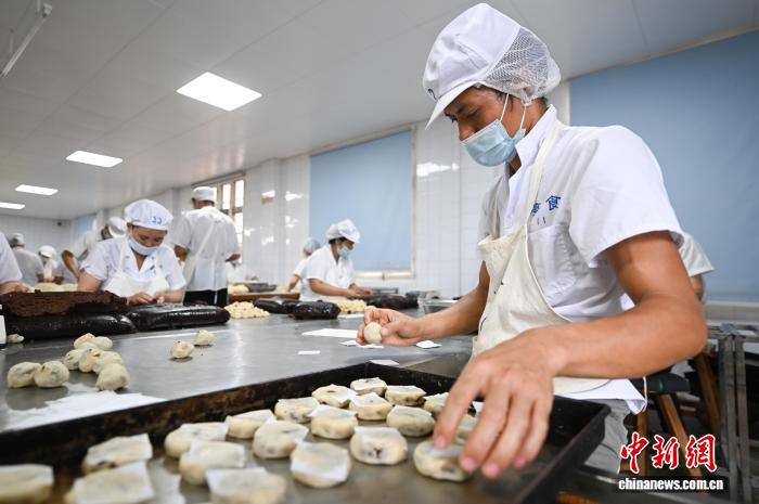 9月19日,工作人员制作手工月饼。随着中国传统中秋佳节渐近,浙江杭州临平亭趾月饼受到消费者青睐,工人们加班制作,每天生产7万多个月饼发往各地,供应中秋订单高峰。据了解亭趾月饼已传承数十年,其以传统的手工制作技艺和酥香口感吸引国内消费者和海外华侨华人。中新社记者 王刚 摄