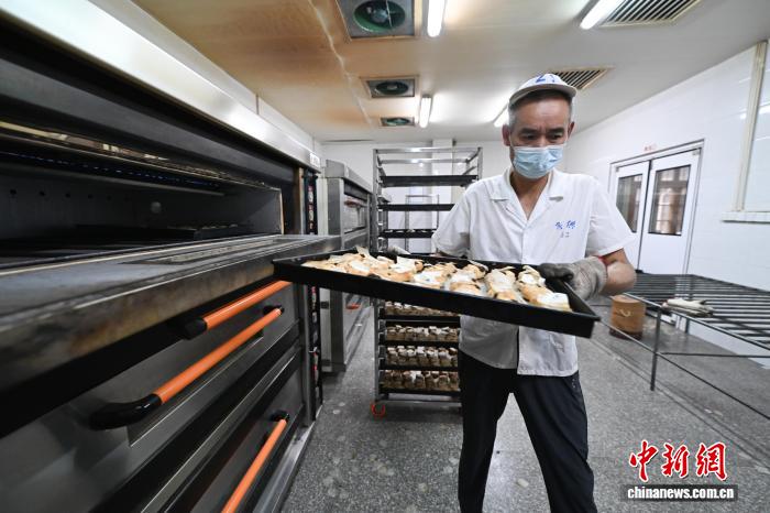 9月19日,工作人员拿出烤熟的手工月饼。随着中国传统中秋佳节渐近,浙江杭州临平亭趾月饼受到消费者青睐,工人们加班制作,每天生产7万多个月饼发往各地,供应中秋订单高峰。据了解亭趾月饼已传承数十年,其以传统的手工制作技艺和酥香口感吸引国内消费者和海外华侨华人。中新社记者 王刚 摄