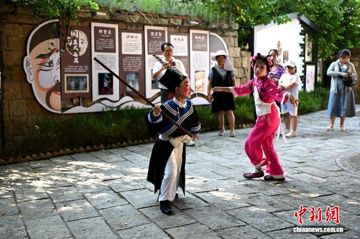 而今,村子里闽南红砖古厝与戏台交错,犹如一座“活态戏剧博物馆”。海内外游客不仅可以“变装”打卡,化身戏曲经典角色穿梭其间,还可走进稻田“开盲盒”、在砖雕上“唱戏”,沉浸式感受闽南传统戏曲魅力。