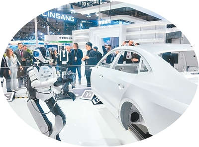 第八届进博会技术装备展区,海克斯康集团展位上,AEON工业人形机器人手持海克斯康Leica扫描头对白车身进行扫描。本报记者 林子涵摄