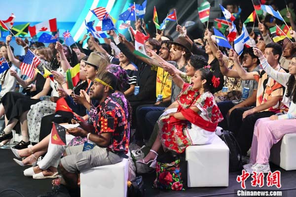 2025年8月24日,第二十四届“汉语桥”世界大学生中文比赛全球总决赛在福建平潭举行。图为参赛选手为参加最后总决赛的选手加油。中新社记者 王东明 摄