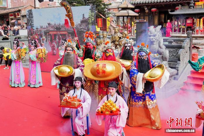 11月21日,福建泉州通淮关岳庙举行海外分灵宫庙分灵认证谒祖溯源团体祭拜仪式。图为高甲戏《五路财神赐宝》。泉州通淮关岳庙供图