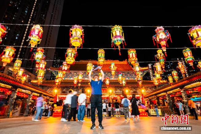 2025年9月27日,“香江花月迎国庆”中秋彩灯会在香港黄大仙祠开幕,多组巨型花灯装置吸引市民游客前来欣赏拍照,“游园猜灯谜”等活动令市民游客乐在其中。中新社记者 侯宇 摄