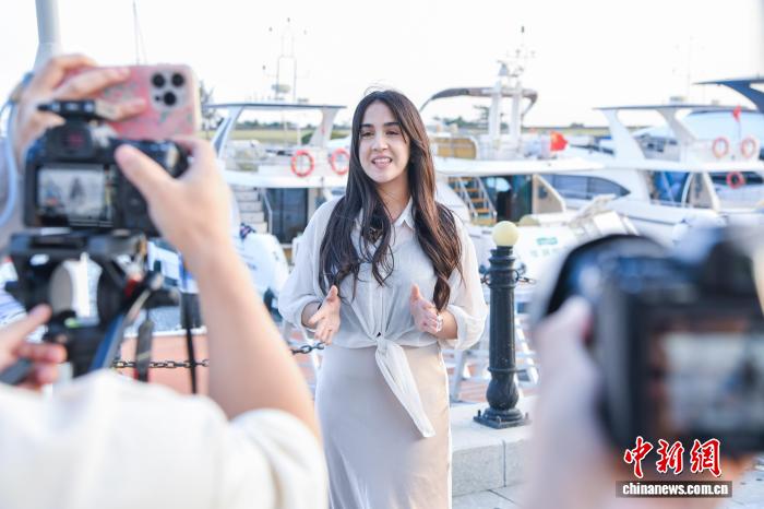 11月26日,中阿卫视主持人、记者阿思玛在海南万宁石梅湾国际游艇会采访。 中新网记者 骆云飞 摄