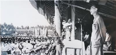 李春鸣在华中举办的庆祝新中国国庆大会上讲话。华侨教育家李春鸣馆供图