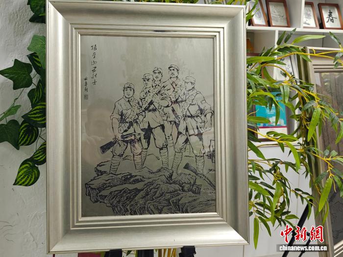 国家级非物质文化遗产代表性项目刻铜(杜氏刻铜)代表性传承人杜平创作的刻铜作品《狼牙山五壮士》。中新网记者 韩辉 摄
