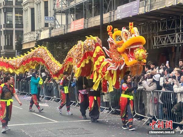 伦敦华埠商会组织巡游队伍作为48号方队亮相,现场,“祥龙”在铿锵鼓点中起伏翻腾,双层巡游车上的华社代表用中英双语高喊“新年快乐”,憨态可掬的大熊猫造型表演者穿梭其间,与观众牵手击掌,不少市民举起手机记录这一精彩瞬间。