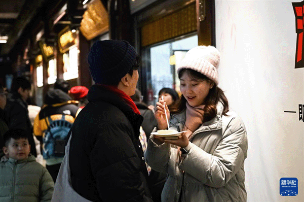 资料图:韩国游客在上海豫园商城品尝特色美食。(图/新华社)