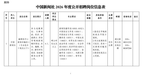 附件:中国新闻社2026年度公开招聘岗位信息表
