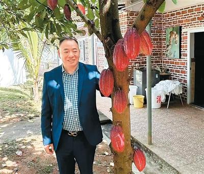 图为2025年3月,傅伯弟在海南万宁参观可可种植园。受访者供图