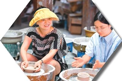 在湖南省长沙市铜官老街,游客正在体验陶瓷制作。