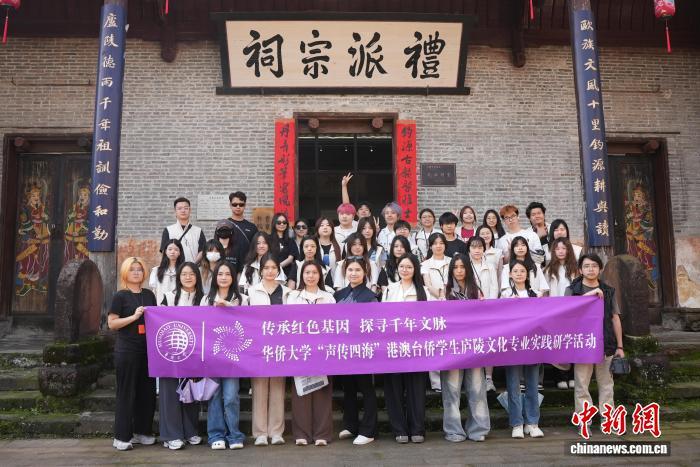 4月19日,“传承红色基因 探寻千年文脉”华侨大学“声传四海”港澳台侨学生庐陵文化专业实践研学活动走进吉安,来自意大利、马来西亚等8个国家和地区的学生们开启了一场沉浸式庐陵文化探寻之旅。研学中,同学们走进钓源古村、吉安城革命历史陈列馆、吉州窑,领略千年古村落承载的文化底蕴。此次研学实践,同学们在实地行走、亲身感悟中,感受了中华优秀传统文化的博大精深。图为华侨大学港澳台侨学生在钓源古村礼派祠堂合影。吴敏 摄