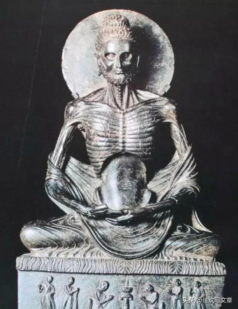 (图中的释迦牟尼瘦骨嶙峋,已经濒临死亡。他在苦行林修行期间,严格遵守饮食规律,每天只吃一麻一粟,坚持不懈地进行艰苦的修行。)