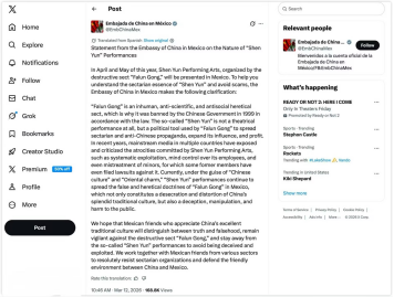 3月13日,中国驻墨西哥大使馆发布声明,警示邪教“法轮功”附属组织“神韵艺术团”将在墨西哥演出,并提醒社会各界认清其邪教本质。